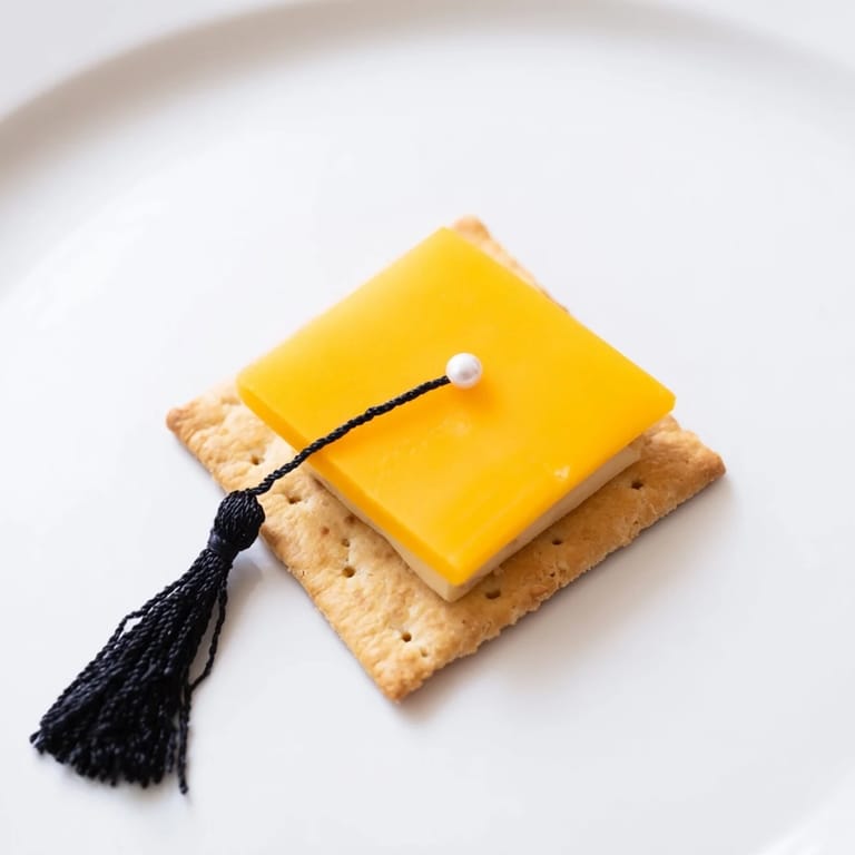 - Take a tiny dab—and I mean tiny—of cream cheese or hummus and place it at one corner of the cheese square. Press one end of your licorice or fruit strip into it and let the rest drape naturally over the edge like a real graduation tassel. This is where the magic happens