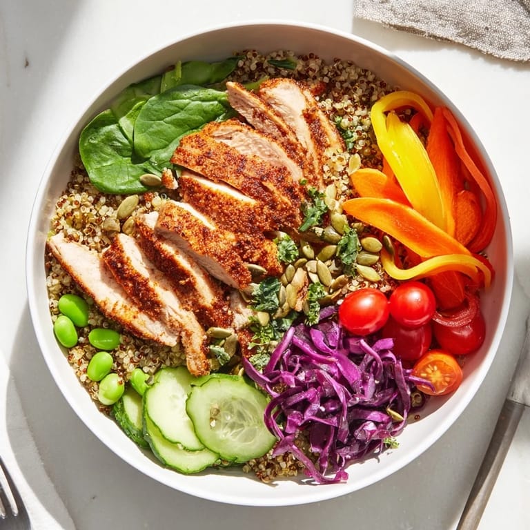 Save A vibrant nutrient-packed meal featuring colorful vegetables wholesome grains lean protein and a zesty dressing designed for easy meal-prep and beautiful presentation.