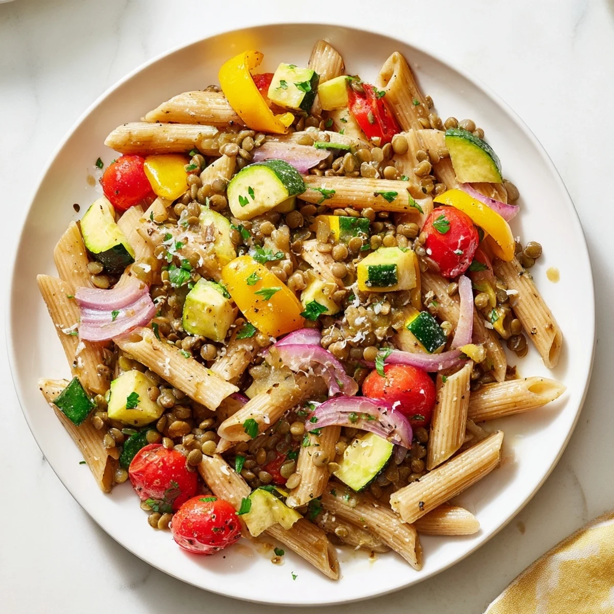 The lentils do most of the heavy lifting here, bringing protein and earthiness that makes the dish feel substantial without needing cream or meat. The roasted vegetables aren't just decoration; they caramelize into concentrated sweetness that balances lentil's mineral quality. And the pasta is really just the vehicle—what matters is how all three elements come together with that silky pasta water to create something that's greater than the sum of its parts.