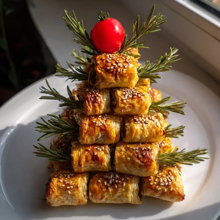 Save A festive, crowd-pleasing appetizer featuring golden, flaky mini sausage rolls arranged in the shape of a Christmas tree—perfect for holiday gatherings.