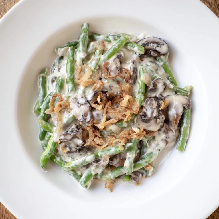 Save A nostalgic, creamy side dish featuring tender green beans, savory mushrooms, and crispy fried onions—a classic for holiday feasts and family dinners.