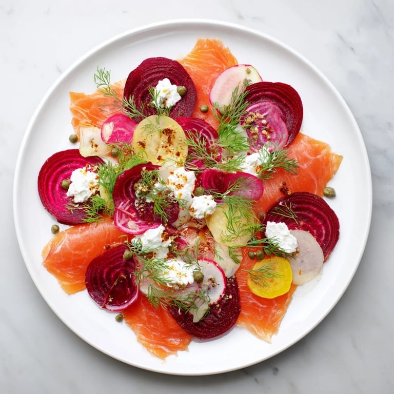 - Neatly arrange the roasted beet slices, fennel, radishes, baby arugula, and pickled red onions around the salmon.