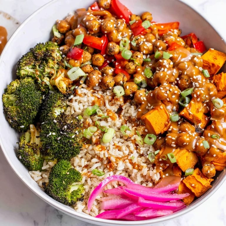 - Divide cooked grains among four bowls. Top with roasted vegetables and chickpeas. Drizzle generously with one or both sauces. Garnish with green onions, sesame seeds, and pickled red onions if desired.