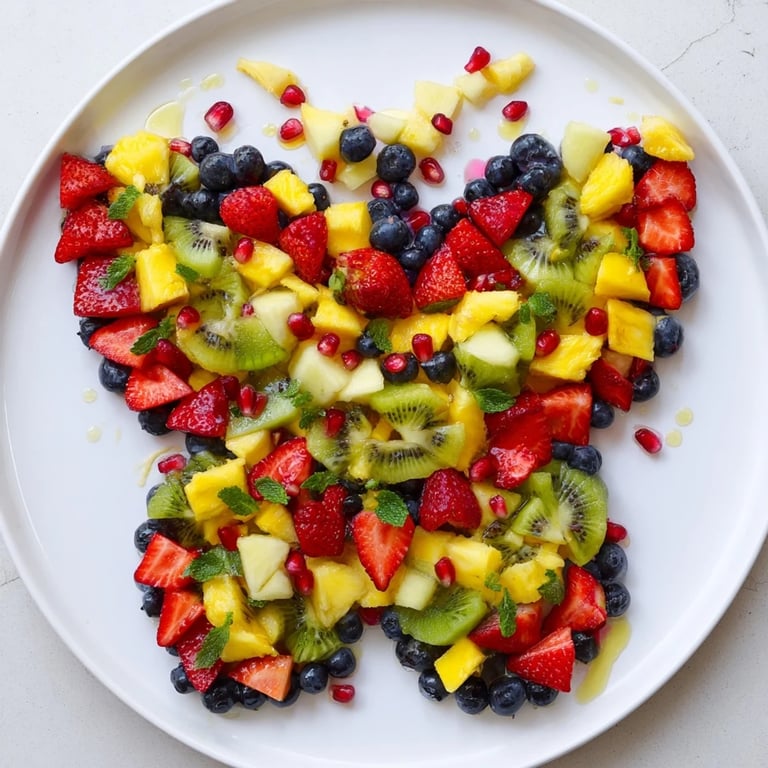 Save This bright and playful salad combines the sweetness and tartness of summer fruits with the freshness of mint and the zing of lime juice, balanced by a honey glaze that can be easily swapped for agave syrup to keep it fully vegan. The butterfly arrangement turns a simple fruit salad into a delightful centerpiece, showcasing your creativity and taste for French-inspired elegance.