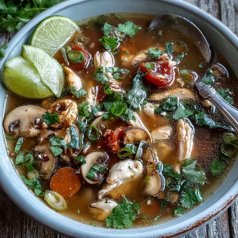 Spicy, sour, and aromatic Thai-style chicken soup with citrusy herbs and fresh vegetables.